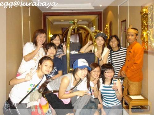 從飯店的外觀看不出華麗所在,不過一進到寬敞lobby馬上可以感受豪華氣氛,儘管夜暮低垂,我們一下車,還是有幾個服務生馬上推著可愛的行李車過來幫忙搬行李,印尼是個很重視小費的國家,拿行李的小費,一間房間大約是1000盾(3.3元新台幣)要是領台灣薪水在印尼花用那真是天天都能過大爺的生活。