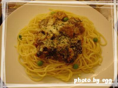 朋友點的雞肉義大利麵先上(忘了全名,反正有麵有肉啦),份量普通,男生一定會不夠,沒有味覺的朋友三兩下就解決掉了,雞肉頗嫩,我愛上面的起司粉,麵條不會很軟爛,不過egg還是比較期待焗馬鈴薯
