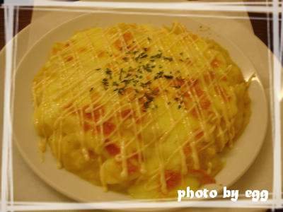 看了menu才知道podova的招牌是焗馬鈴薯,套餐價格都在200左右,還有鬆餅、義大利麵、焗飯、三明治任君挑選,egg的首選當然是焗馬鈴薯囉!想到會牽絲的起司起司肚子都餓了,點餐後小姐迅速上了玉米濃湯,很一般的湯,灑上黑胡椒味道比較夠!