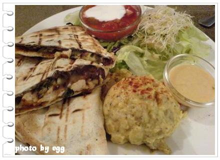 愛美墨食物的小魚點的好像是起司雞肉捲+凱薩沙拉+馬鈴薯沙拉,雞肉捲還蠻得小魚的歡心,尤其是紅色疑似莎莎醬的東西,裡面不知道是不是有什麼豆泥,有點小辣,整個就是很墨西哥。
