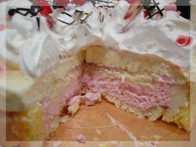 這個20分內完工的草莓提拉上面有厚厚一層奶油,因為冰不夠久,回家我們送禮物、吹蠟燭、閒聊又耗費一堆時間,吃起來的口感像冰淇淋,再冰一點會更好!