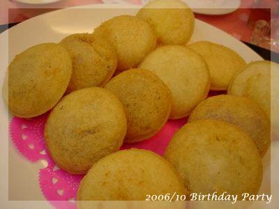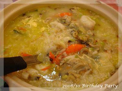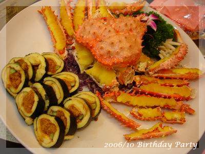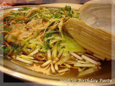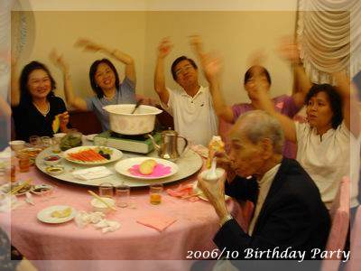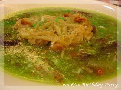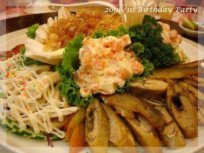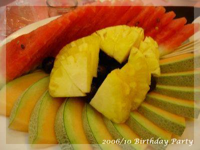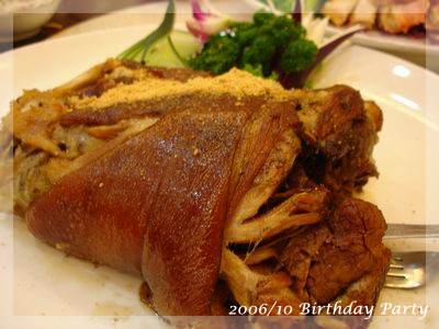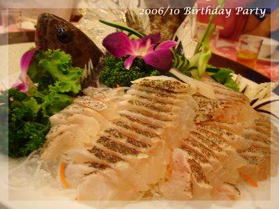 ,超得意的哩!一直吃到最後一道水果,突然驚覺,咦?這次沒有壽桃、麵線跟紅蛋ㄝ,一般到餐廳去,沒人會喜歡吃那種一吃就飽的菜色,偏偏我們這桌小孩以壽桃跟紅蛋為主食,壽桃除了好吃還可以把上面裝飾的綠葉黏在嘴上當鬍鬚,小小娛樂一番,至於水煮蛋大家平常也不怎麼愛,可是看到有人在剝蛋殼,不知不覺也會拿一顆來湊熱鬧,最後再把蛋黃交給小老闆解決:P,這次少了壽桃跟紅蛋,有剝奪樂趣之嫌!