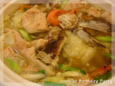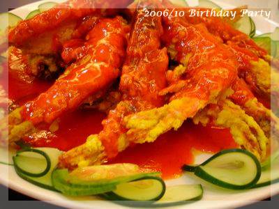第一道冷盤,跟第二道生魚片,幾乎都是我不敢吃的菜0rz,而且肚子餓的時候超想吃熱食的,剛開始的幾道菜,我們這桌的餓鬼還是厲害的盤盤掃空,大人想打包都沒有哩!至於這次的菜色,一直到第七道的大豬腳大家的飽足感才湧現,大豬腳是開喜的新菜色,不僅入味,皮跟肉都到入口即化的程度,爺爺應該很愛,最後還剩了大半隻,隔天出現在我家的餐桌上!之後上的大蝦子,聽說一尾要價260,吃不下也要記得打包,不過本人一向勤儉持家,直嚷給我現金吧!!!之後還有生魚片那條魚煮的火鍋湯,一桌人邊念後繼無力,還是邊舀湯,最後不知道那鍋湯有沒有被小家雙俠帶回淡水。火鍋之後還有蝦餃、冰淇淋跟水果,蝦餃裡面不知道有蔥還是韭菜,本人就敬謝不敏了,不過看樣子蝦子還蠻大的,應該是很不錯。接著上來的是炸冰淇淋,不知道從什麼時候開始,大家以拿到芋頭口味為恥,每次炸冰淇淋一上桌,整桌的小鬼就開始猜測芋頭在哪裡?拿到芋頭的總要哀嚎幾聲才不負大家期望,偏偏每次芋頭口味的又最多,這次我拿到隱藏版...咖啡口味