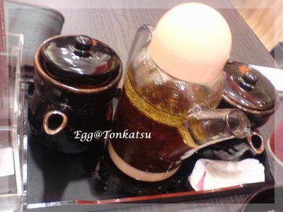 招來店員才知道上圖左右黑色瓷瓶裝的是豬排醬,其中一瓶是辣味,不過我吃起來沒什麼感覺@@,中間的油醋可以伴著高麗菜絲吃,看起來很油,請記得稍微搖晃再倒,嚐起來味道不錯,挺爽口的。