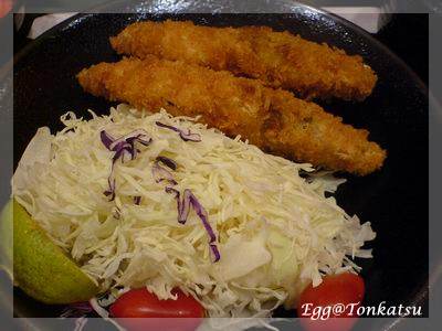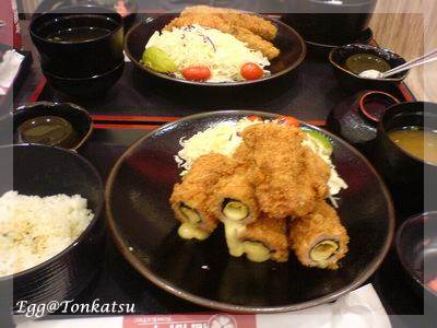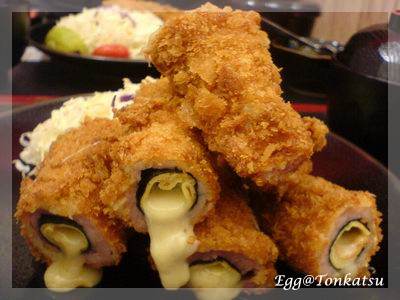 我的豬排起司捲,看到起司緩緩流出,就沒後悔點這個啦!跟炸蝦一樣,麵衣酥脆,除了肉片還有海苔蛋皮包在裡面,而且份量不少,算是成功的一品!