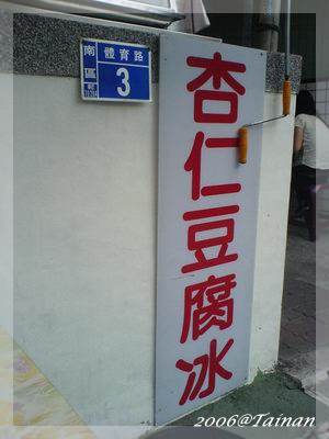 吃完米糕,一定要來點甜點,網路上在地人超推薦的杏仁豆腐冰一定要去嚐嚐,何況我超愛吃杏仁豆腐的,一路從府前路轉向健康路,經過台南市體育場,都快接到林森路卻怎麼都找不到健康路3號,繞了體育場一大圈,突然看到斗大的【杏仁豆腐冰】出現眼前,啊!我是豬頭
