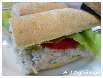 因為貝果比較常吃,兩人都選了長拖鞋,口感很紮實,來貼心的切成兩半,方便分食,長拖鞋裡夾著厚厚的雞肉沙拉,還有生菜、蕃茄,誠意十足