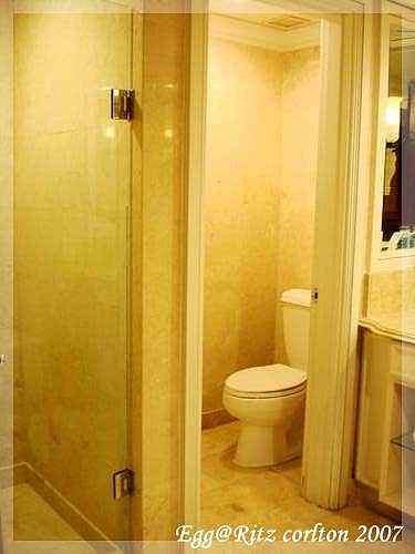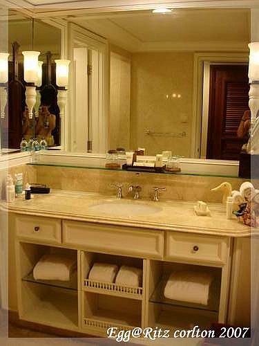 房間內的大浴室分為三大部分,門一打開,有整面牆的大鏡子,除了床邊小茶几放了礦泉水,浴室也會放上一兩瓶,洗臉台的下方每天都會換上乾淨的大浴巾、毛巾各二,連續住三個晚上,所以第一天我就把我眾多"ㄍㄟ西"放在洗臉台上,眼鏡、藥水、泡沫膠、洗面乳一堆有的沒的,不管洗臉台被我搞的多亂,每天回飯店後一定有個毫無水痕的乾淨洗臉台,這種亂丟後有人收拾的感受實在是無法言喻的幸福