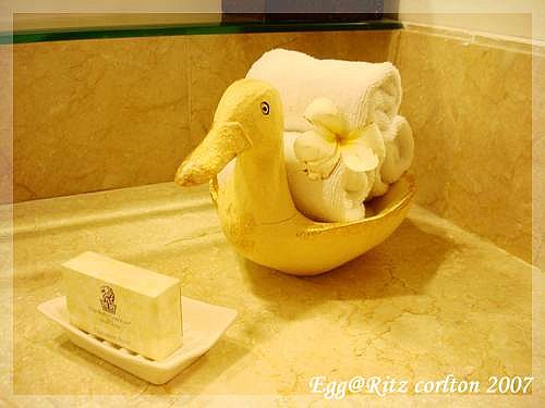 另外洗臉台上除了香皂,可愛木雕鴨上還戴著三條捲筒狀擦手用的乾毛巾,當然不忘用雞蛋花裝飾