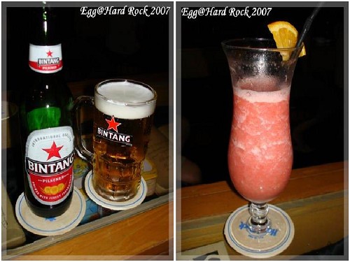 逛完KUTA大街,下一站是HARD ROCK飯店裡面的PUB,禮拜四是LADYS NIGHT,女生點幾款限定的飲料通通半價喔!只是這家PUB不怎麼好找,沿著KUTA海灘方向走,沒多久就看到星巴克旁的HARD ROCK專賣店,不過東西貴桑桑,打折款又看不入眼,得以全身而退,之後又問了好幾個路人,遭到一陣幾分鐘的滂沱大雨襲擊後才順利找到隱身於飯店內的PUB。