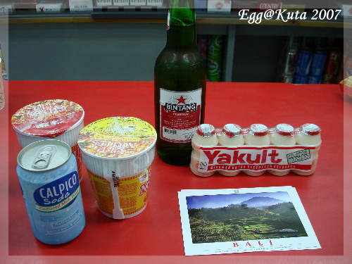 聽完歌還看了一段舞蹈表演,差不多該打道回飯店了,回程順道進OK補給一些民生必需品還有買了兩張明信片,出來準備攔截藍鳥,所謂的藍鳥計程車,除了車子是藍色的,計程車上還有一隻藍色小鳥做為標誌,不過走了一會兒,不是招不到就是車裡有人,一旁很多計程車紛紛問我們是不是要搭乘,今天在KUTA已經吃過虧,儘管再累,四個人還是堅持一定要招到藍鳥,所幸不久就出現一台藍鳥計程車解救我們,只是上車的時候還被眾多計程車司機噓,怪恐怖的@@,KUTA街頭可能外國客多,感覺應該是最不寧靜的,走在路上真的有人會向你喊著"大媽""大媽",原本YENYU聽到人家叫他大媽正要發火,想了一下才意會過來是印式腔中文"大麻",大麻都可以隨街叫賣是扯了點,所以囉!晚上在KUTA閒晃,記得注意安全嘿!