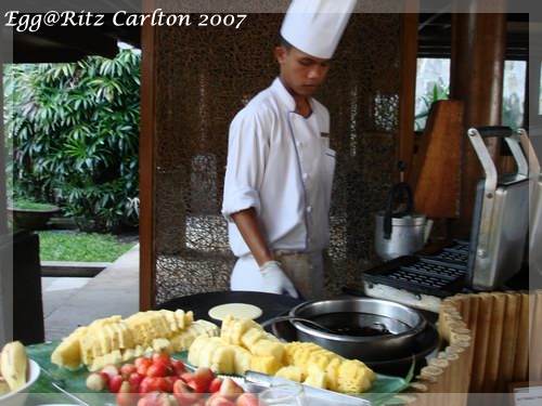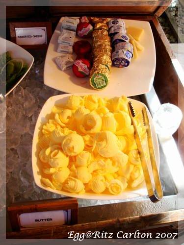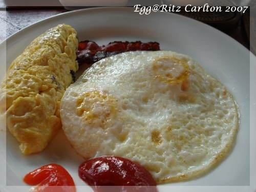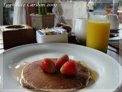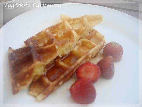 格子鬆餅一次有兩片,這相片是在相機起霧的狀態下照的,鬆餅雖然好吃,不過一餐吃一個也就夠了,聽說人氣旺的時候還大排長龍,記得到RITZ吃早餐,先排鬆餅準沒錯,第一天姍姍來遲的劉氏夫妻原本要被帶到下面的義大利餐廳吃飯,不過他們硬是找位子坐下,然後點了幾個鬆餅解決早餐。