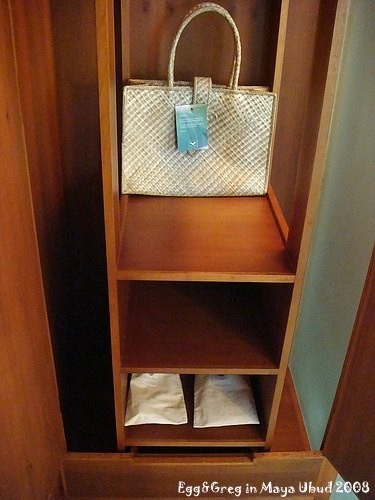 其中一邊的櫃子放著竹籐包、吹風機跟兩雙室內拖鞋