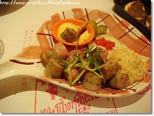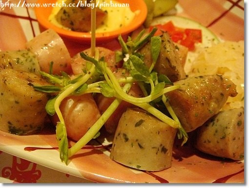 用著可愛器皿裝著顏色分明的兩種香腸很快上桌