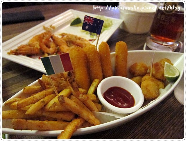 原本這個拼盤是洋蔥圈、起司條、鱈魚塊的組合