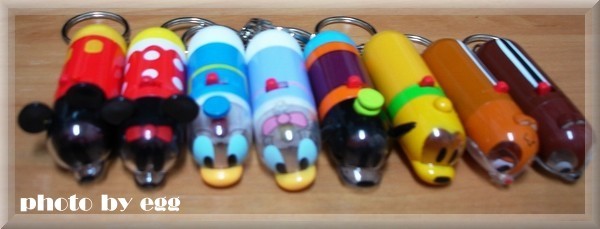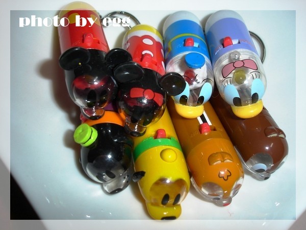 看到其他Disney其他系列出現就知道疊疊樂已經不能滿足我了",前陣子不小心發現這組迷你手電筒一組八隻,有米奇、米妮、唐老鴨、黛安、高飛、布魯托、奇奇、蒂蒂...最最特別的地方是投射出來的燈光會出現他們可愛的臉臉喔!!!大概過年前這組扭蛋就被搶購一空,後來朋友的幫忙egg幸運地在一家不起眼的文具店以高價買到...興奮啊!!!馬上拆開玩他的投射燈可愛到不行啦!!!不過我的唐老鴨不會亮>"<敗筆!後來可能是消費者詢問激烈,光我就不知道跑了幾家扭蛋店問了,商家又進了第二次,最近路上的轉蛋機又重現他們的身影啦!!!可愛可愛啊!!!買到玩具的心情,大概就跟吃完麻辣鍋一樣滿足吧