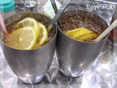 點完餐後送上我們的檸檬凍飲(10+2)凍飲加兩元,除了吸管外還有一直長湯匙,可以依自己喜歡的酸度動手擠壓檸檬,檸檬切片給的還不少,大約有十片,碎冰剛好是我喜歡的那種,根據幾次喝鴛鴦的經驗,檸檬茶好喝多了。