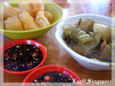地主們像風一樣點了一堆東西,無辜的我們只能在旁邊叫點少點啦!前晚被你們操太晚,到現在還食慾不振@@。過不久,一碟碟寫菜上桌,油條是要放到肉骨茶裡吸湯汁的,不像台灣油條會炸的金黃焦脆,旁邊的酸菜滋味就很棒,酸酸脆脆很入味。