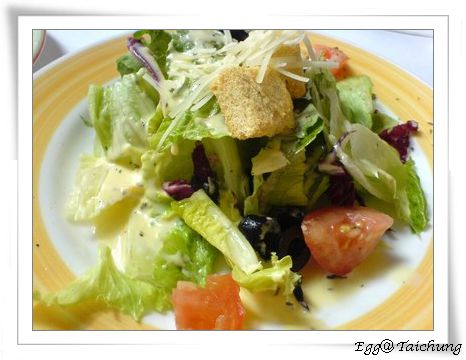首先上來的沙拉我們選了葡萄柚優格跟地中海橘香的醬汁,葡萄柚的口感偏酸,名字很夢幻的地中海橘香帶著淡淡的橘子味,順口多了!下面這張是大家比較喜歡的地中海橘香