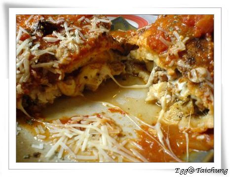 這個大水餃有酥脆的外皮,要費一些力才切的開,整體來說是蕃茄口味,切開來除了雞肉、香腸這些配料還有些不知名的香料,再來就是讓人食指大動會牽絲的起司了