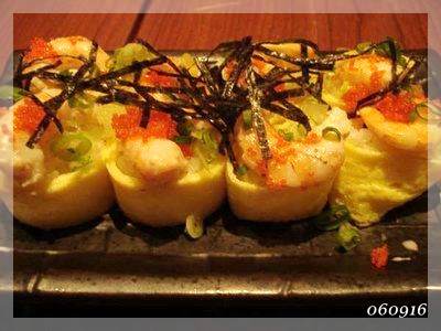 一份八個,包著醋飯的是嫩嫩的蛋皮,上面擺上新鮮蝦子跟魚卵,總之...是好吃又有飽足感的一道