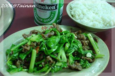 肚子不爭氣,加上天氣炎熱,吃不下有名的牛肉火鍋,看到別桌阿伯的芥蘭牛肉好像不賴,依樣畫葫蘆的點了一份,加上海尼根,堪稱最完美組合啦!