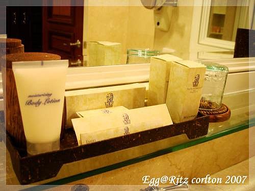 房間內的大浴室分為三大部分,門一打開,有整面牆的大鏡子,除了床邊小茶几放了礦泉水,浴室也會放上一兩瓶,洗臉台的下方每天都會換上乾淨的大浴巾、毛巾各二,連續住三個晚上,所以第一天我就把我眾多"ㄍㄟ西"放在洗臉台上,眼鏡、藥水、泡沫膠、洗面乳一堆有的沒的,不管洗臉台被我搞的多亂,每天回飯店後一定有個毫無水痕的乾淨洗臉台,這種亂丟後有人收拾的感受實在是無法言喻的幸福