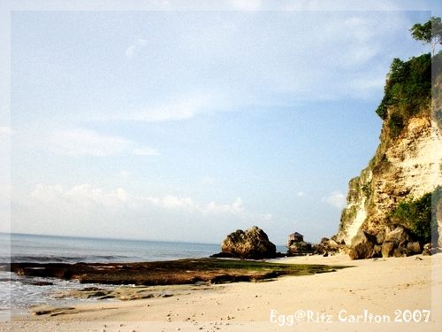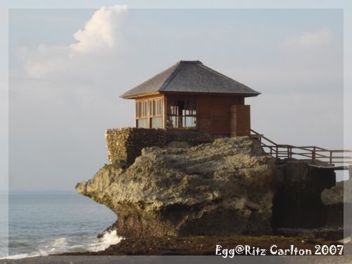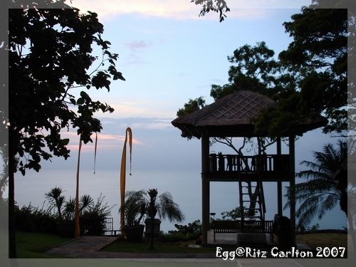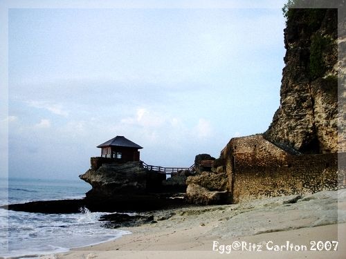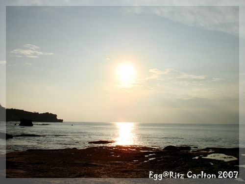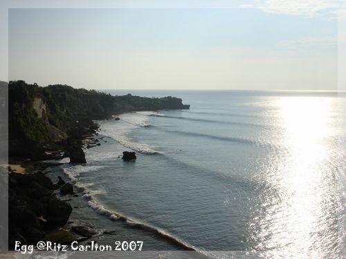 下午慵懶睡醒,悠閒的抹了防曬油跟防蚊液準備出發到凡住麗池必訪的景點...私人沙灘,對於私人沙灘在哪裡,怎麼去,我絲毫沒有概念,到大廳櫃臺詢問工作人員,他告訴我們需要免費接送巴士的話要到大門口服務台,叫了車後,在門口等了老半天,看一台台的園內高爾夫接駁車來來去去,客人一組一組離開,正覺得不耐煩之際,來了一大台箱型車,哇...待遇醬好喔!我們只是要去個沙灘,開這麼一大台來,上車後,看著司機往飯店外駛,老覺得是不是溝通有誤,一度覺得司機會送我們到麗池飯店下方的金巴蘭沙灘,一再一再確定我們要去的地點後,約莫五分後...停車了,下車看到這幅遼闊的景觀、陡峭的懸崖才知道原來麗池有兩個沙灘,一個是在飯店下方(我們原本計畫要去的),一個在離飯店比較遠的懸崖邊,就這樣誤打誤撞讓我們跟這個行程外的私人沙灘有場美麗的邂逅