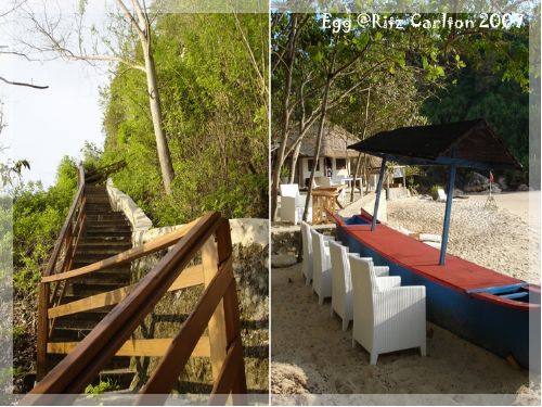 走下排驚人階梯其實不太難,只要踏穩腳步慢慢來即可,可是常常遮陽遮的太徹底,又是帽子又是陽傘,很容易擋住視線,一不注意馬上踩空@@,沿途還有石椅可坐,邊走邊驚嘆美景,讚美一下造物者的偉大,不知不覺也到了山腳下,圖片的右邊就是剛下樓梯處有幾張位子,及小小的發呆亭,儘管離凡飯店有一段距離,還有服務人員駐守,需要什麼飲料或轎車服務通知一聲即可。