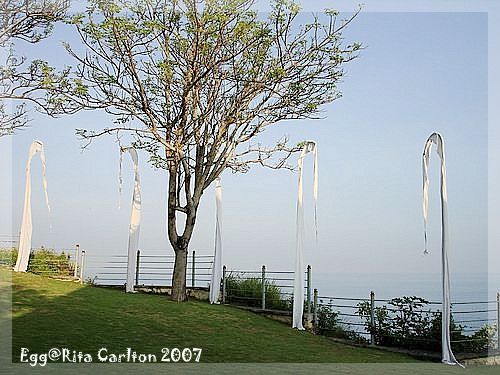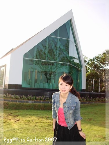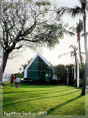 透明綠色玻璃的教堂,我想每個女生都會很愛,一大早太陽出來不久,天還不夠藍,幾乎要跟教堂的白色屋頂融為一體,嚴格來說,這邊是教堂的後門,這片面海的大草皮大概是儀式結束,讓新人與親友合照的好地方
