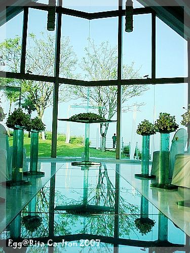 教堂空間不大,但是小而巧,完全呈現舒服浪漫的風情,中間的走道有別於一般的紅地毯,是透明玻璃喔!還看的到玻璃下面的白沙