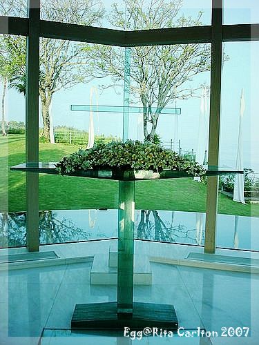 中間的十字架也是透明的,突然覺得這透明夢幻教堂好像不適合喔密陀佛的信徒,話雖如此,有朋友要在這邊結婚,用游泳的也要去參加(謎之聲:我跟大海根本不熟)