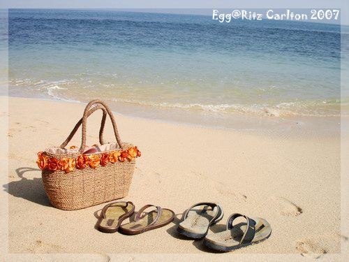 再往下方走一點是個乾淨的沙灘,印不出明顯的腳印,只好用脫鞋代表。右邊的包包就是我在聖泉廟努力殺價來的竹籐包,大約200NT,質地蠻精緻的,裡面也有內襯,而且他夠大,可以讓我很開心的往裡面丟東西:P。