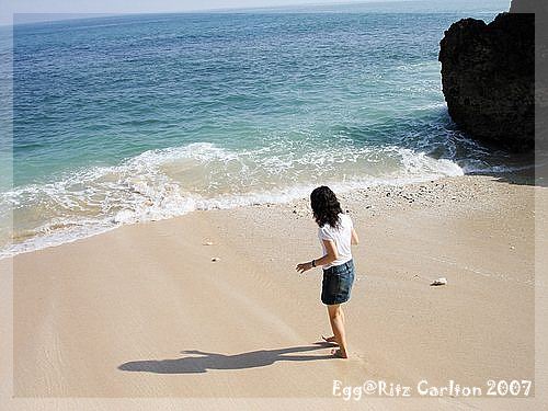 路過我們最常逗留的發呆亭,沿著海邊的階梯向下,才走一下下,哇!別有洞天,而且有游泳池ㄝ!一早劉氏夫妻就來過這邊,回來後一直極力稱讚這個藍白希臘風的游泳池,其實劉先生在第三天大家再發呆亭裡發懶的時候,自己就先晃到這邊來,回來只淡淡的說下面蠻漂亮的,沒有極力推銷並強迫我們跟他一起下階梯,後來又不巧把懸崖看日落的沙灘跟這個小小的白沙灘搞錯,差點就要錯過這有讓人置身希臘錯覺的美麗泳池。