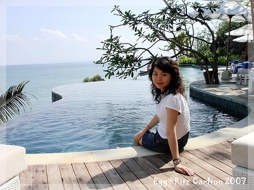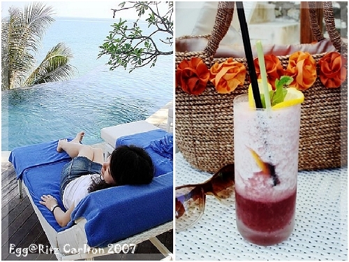 躺在岸邊當然也不能虧待自己,看了漏漏長的MENU,種類繁多,不過找不到之前看人家在游泳池畔喝的西瓜盅或哈密瓜盅,天氣這麼熱,點個Frozen的一定沒錯,上來就是這杯西瓜冰茶,細細的碎冰 解救我不能跳下泳池的哀怨,不過小小一杯含稅後要價RP50820,大約台幣200多,很丟臉的是我忘了帶皮夾,GREG只有兩張RP50000,拿給服務生找,沒想到後來找回一張RP50000的整鈔,那零頭不會是服務生自己吸收了吧