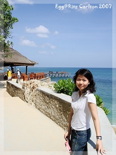 游完泳,喔!不!是看人家游完泳(醋意有很深嗎?),爬上階梯,大約10點多,天空大海早就藍得很囂張,當然太陽也大得不得了,所以GREG的褲子在回房間前就乾了,下一站,馬不停蹄的前往另一個夢幻教堂!!!