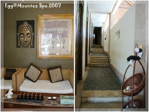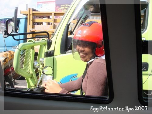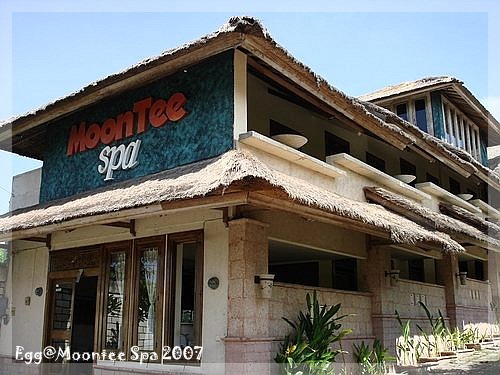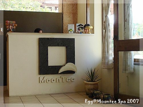 大約11點半,接送我們的司機已經到麗池門口站衛兵,這跟我們原本預定的時間有出入,所以大家一直拖拖拖到12點多才出來,這位黑黑高大的司機開來一輛廂型巴士,這點就令我們很滿意。預定做SPA的地點雖然在KUTA,不過車子一直在民防小路間打轉,後來一個轉彎,大家還在想..不會是到了吧!MOONTEE招牌矗立眼前。