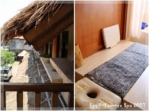 房間陳設非常簡單,其實是簡陋...,木板中放上一塊軟墊,上頭鋪著花布,然後放頭的軟墊四周鋪著毛巾,老實說看到這幅景象還蠻想逃走的,尤其我又不是愛按摩的人,而且本人懶歸懶,還是很有原則的,只能接受自己的東西髒亂,對於別人的髒亂就完全無法忍受,看著花布跟毛巾,很難相信服務人員有勤勞的再換洗,不過幫我們做SPA的小姐很急,絲毫不讓我有思考的空間,就要我坐下脫鞋,他要開始他的足部按摩,既來之則安之,我只好拚命說服自己,印尼人工很便宜,要他們辛勞洗這些布巾應該不是難事,老闆為了生存之道,應該也會要求員工洗乾淨吧!!!