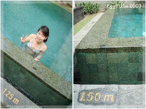 雖然是VILLA游泳池,也是有標示高度的,靠近廚房這邊是1.25M,看我還可以稀鬆平常比YA照相示範高度,到後面1.50M都快要滅頂了