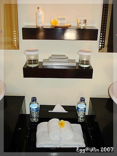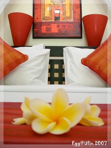 近照來一張,床上貼心的擺了雞蛋花,不管是顏色、擺設,全部都跟在ULIN網站上看到的一模一樣,這床雖美,不過硬梆梆的,不太好睡,被單是乾淨的白色,不過毯子起了毛球,蓋起來很不舒服,在這邊睡了一晚,就好想念麗池那溫床暖枕,輕輕的被子蓋起來沒負擔又保暖。
