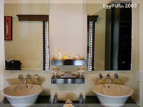 臥室的隔壁是更衣間,YENYU對這個double的洗手台設計讚譽有加,不過我這沒氣氛的人老是覺得更衣間的燈光太暗,讓我搞不清楚臉洗乾淨沒,或是一頭Q髮整理的怎麼樣了!
