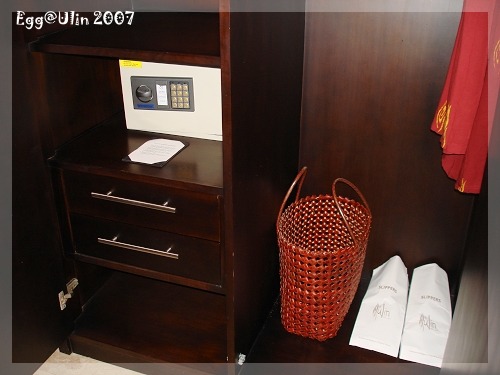 更衣間裡的木質衣櫃一樣有保險箱,不過時間匆忙,沒空慢慢研究怎麼使用,出門的時候貴重物品通通被GREG丟到衣櫃的最上方,根據龜山小家的經驗,他好像很愛藏東西在衣櫃上吼(((筆記ing))),另外衣櫃裡還有大紅浴袍跟拖鞋,浴袍顏色太鮮豔,動都沒有動,另外在VILLA都當野孩子不穿鞋到處跑,拖鞋也沒什麼用武之地。退房的時候,衣櫃算是最完整的歸還。