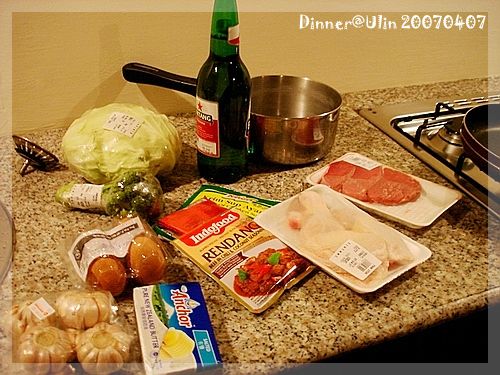 逛了兩圈BINTANG超市,肚子咕嚕咕嚕叫,沒時間讓我細細選購,抓了牛排、雞腿、即時濃湯、青菜、奶油、調味粉、蛋就匆匆結帳,選購的時候才在構思晚餐要吃什麼,ㄧ下義大利麵,ㄧ下又印尼炒麵,最後麵沒有買,印尼炒飯的調味粉倒是帶回來了,然後我我買的一大盒鹽味奶油一直被某人碎碎念,他說冰箱就有塗麵包的小包裝奶油,不過那不一樣嘛(((堅持)))