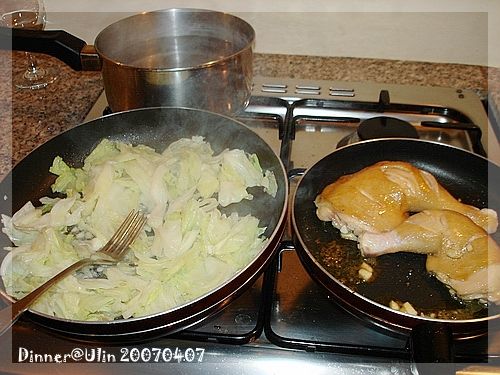 採購完畢跟計程車司機報了ULIN,大約10000RP可以抵達,回去後,兩個只會出一張嘴的人手忙腳亂處理食材,燒水、洗菜、醃雞腿一點步驟順序也沒有,要加多少鹽巴也不懂,最後決定弄個牛排+雞腿排,然後清燙綠花椰跟炒高麗菜,還有雞蓉玉米湯,決定菜色後,蕭大廚努力揮動鍋鏟炒高麗菜,我在旁邊醃雞腿,管他鹽巴、胡椒、啤酒、雞粉通通灑一點進去,放了奶油的高麗菜炒沒幾下就香噴噴(最大功成還是我精挑細選的安佳奶油)
