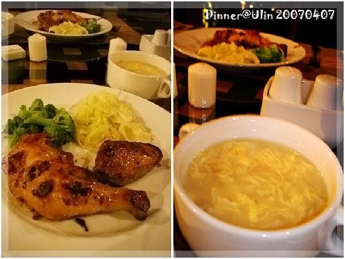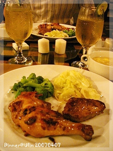 一切就緒後,開開心心的拿出冰箱飲料、雞蛋花蠟燭漂亮擺飾準備來個燭光晚餐,左邊的圖是完成品,香煎雞腿、嫩煎牛排、還有蔬菜擺在一起也頗像樣