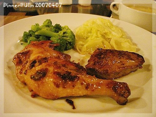 整盤我功勞最大的就是雞腿排,印尼的雞肉整個很合我的口味,再加上胡亂醃製,錦上添花,味道稍稍鹹了一點,配上高麗菜跟燙綠花椰剛剛好,一旁的小牛排也不容忽視,那是GREG說一口好菜下的結晶,盛盤後,撒上一點薄鹽提味,這樣一大盤,配上愉悅的心情,滋味不需要多餘的形容點綴