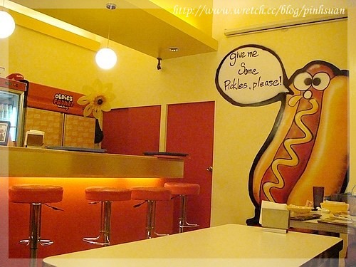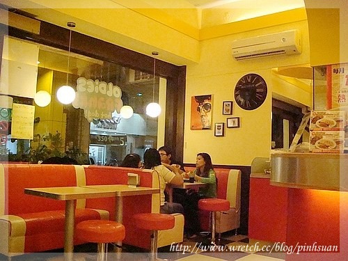 店內空間不大,米白的桌子搭上橘紅色的沙發座椅