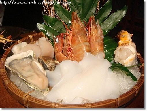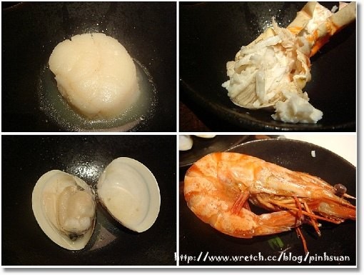 海鮮裡有大干貝、牡蠣、花枝、蛤蜊、大明蝦、蟹腳