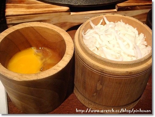 服務生端來一小筒白米飯,上面盛裝幾條白胖的吻仔魚還有一碗蛋液