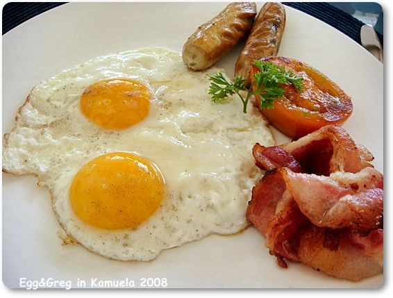 美式早餐還有太陽蛋(也有歐姆蛋可以選)、培根、烤蕃茄跟小香腸